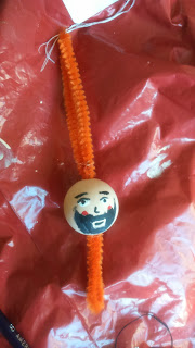 | Once the clothes were made, it was time to move on to the head! The book advises to put the head on to a chenille stem (pipe cleaner) to make it easier to paint. |
